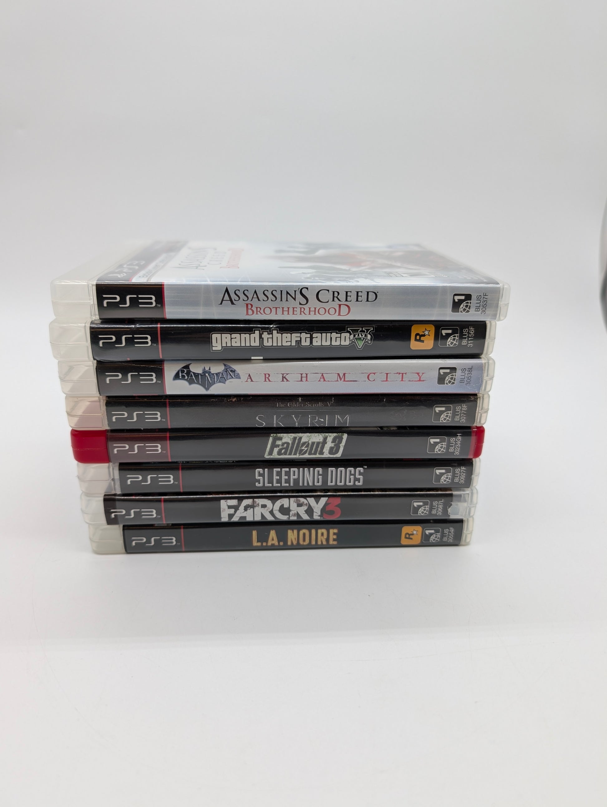 ● L.A. Noire (with box/case and manual) ● Farcry 3 (with box/case and manual) ● Sleeping Dogs (with box/case and manual) ●Fallout 3 (with box/case, no manual) ●The Elder Scrolls V Skyrim (with box/case, no manual) ● Batman: Arkham City (with box/case and manual) ● Assassin's Creed Brotherhood ●Grand Theft Auto 5 (with box/case, no manual)
